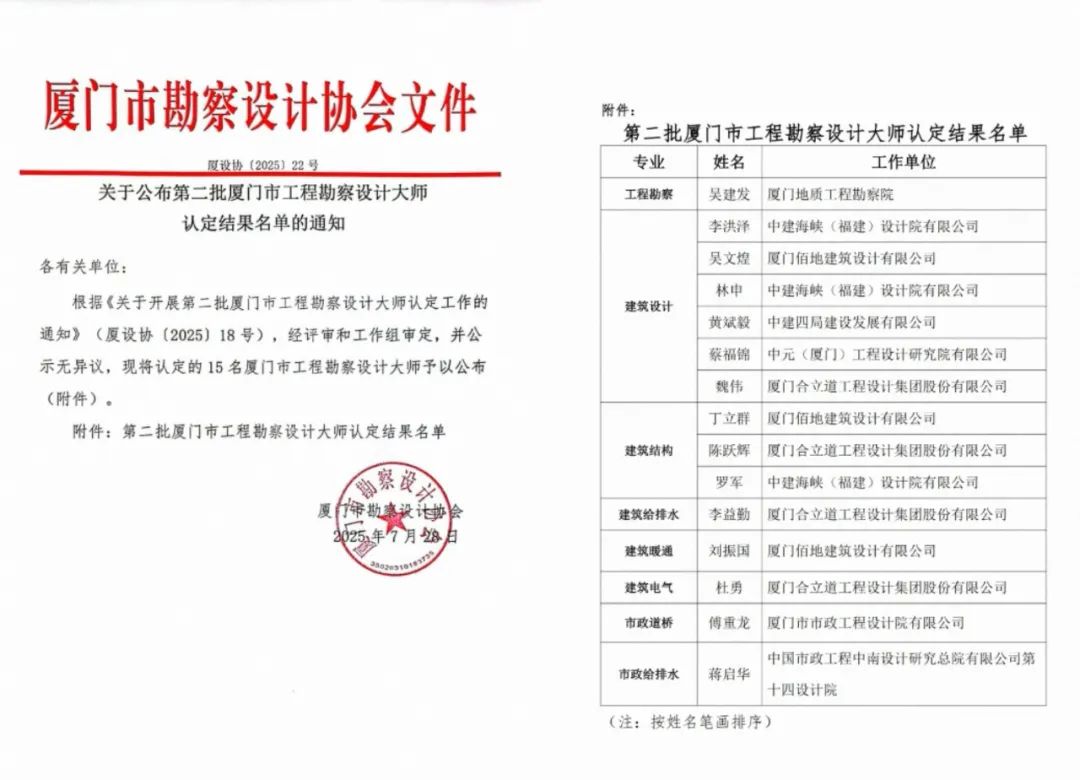 近日,厦门市勘察设计协会公布第二批厦门市工程勘察设计大师名单,中元(厦门)蔡福锦荣列其中。